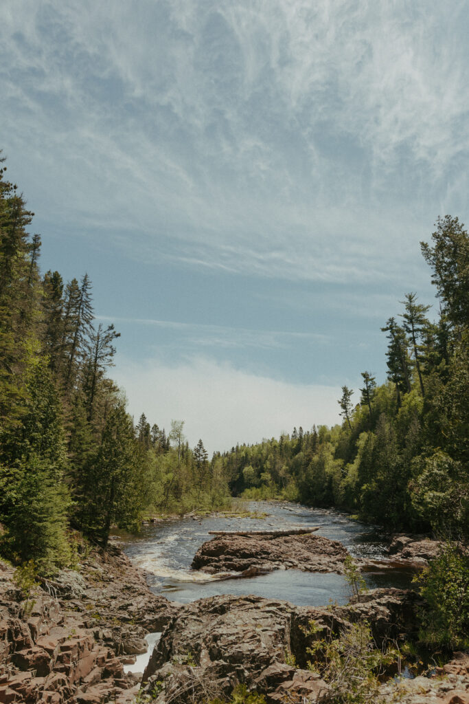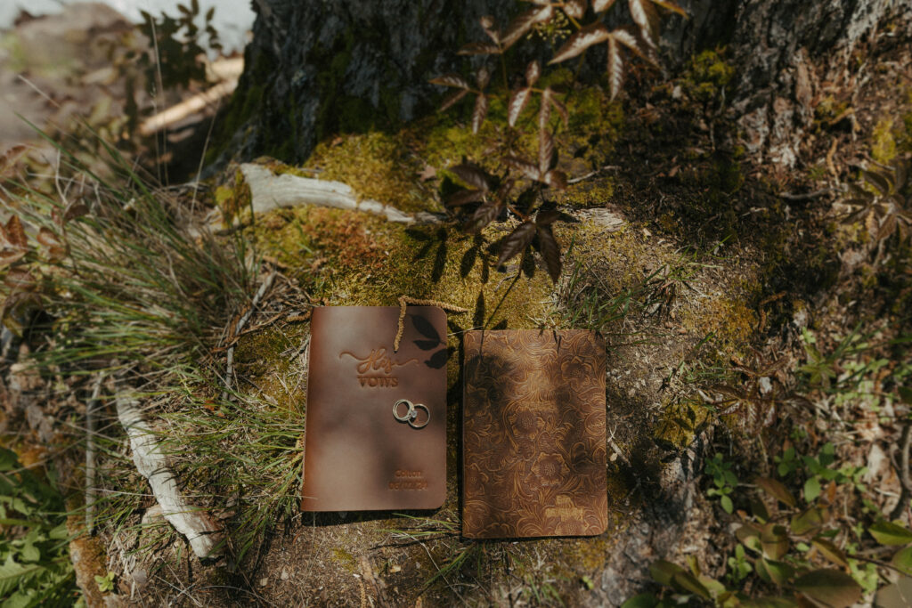 Before heading to their first look, Bobby from Redmond Digital Media (their videographer) and I made sure to capture some of the little details that felt so them. Erin’s dress hung delicately from a tree branch overlooking the Baptism River, the water gliding gently behind it. Their rings and vow books—beautifully bound in leather—sat on a mossy rock nearby, with the sound of the river adding its own soundtrack in the background. Every bit of it felt peaceful and intentional, like their love for nature woven into every corner of their day.