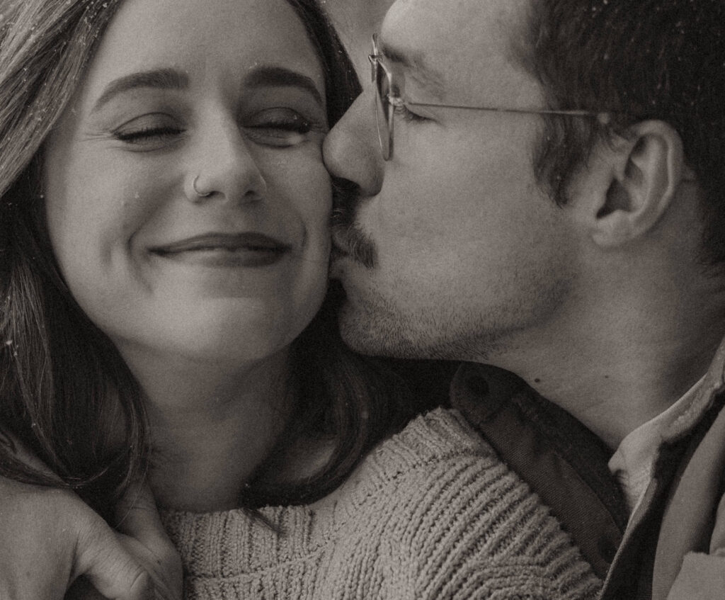 Winter’s unpredictability is part of its charm. You might end up with gently falling snow, clear skies, or even a dramatic overcast—all of which make for stunning photos. If you’re lucky enough to have a fresh snowfall, lean into it! Tossing snow at each other, cuddling under a blanket as snowflakes fall, or even bringing along a pair of vintage sleds can create playful and unique moments.