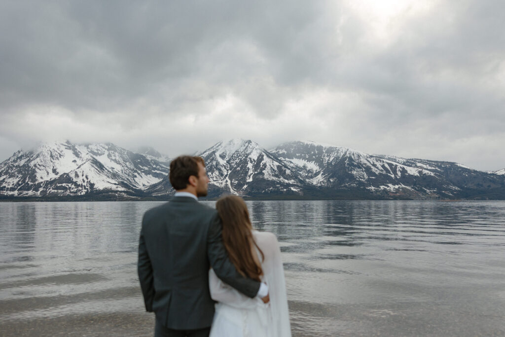 Their Grand Teton National Park elopement unfolded along the quiet shoreline of Colter Bay, surrounded by snowcapped peaks and calm lake reflections. The weather brought soft moody tones — shifting clouds, cool mountain air, and a wide-open landscape that felt like it held the whole world still for them.