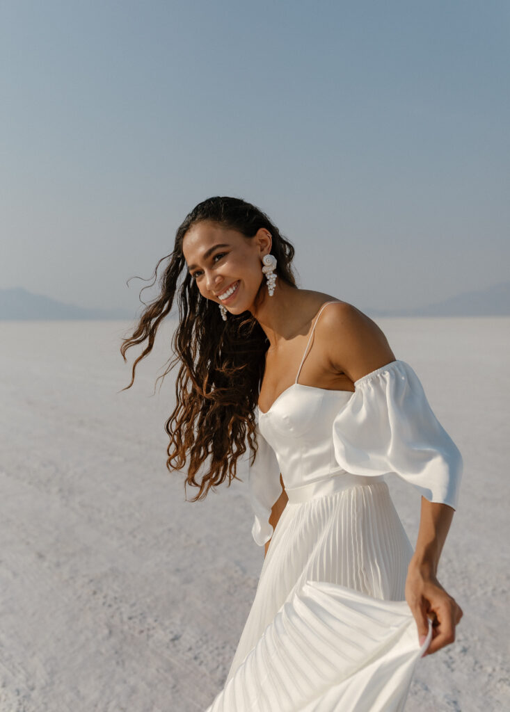 For Janna and Vlad’s stylized elopement inspiration, we leaned into that dreamlike atmosphere — soft fabrics, delicate details, and movement against one of the most minimal yet dramatic landscapes in the American West.