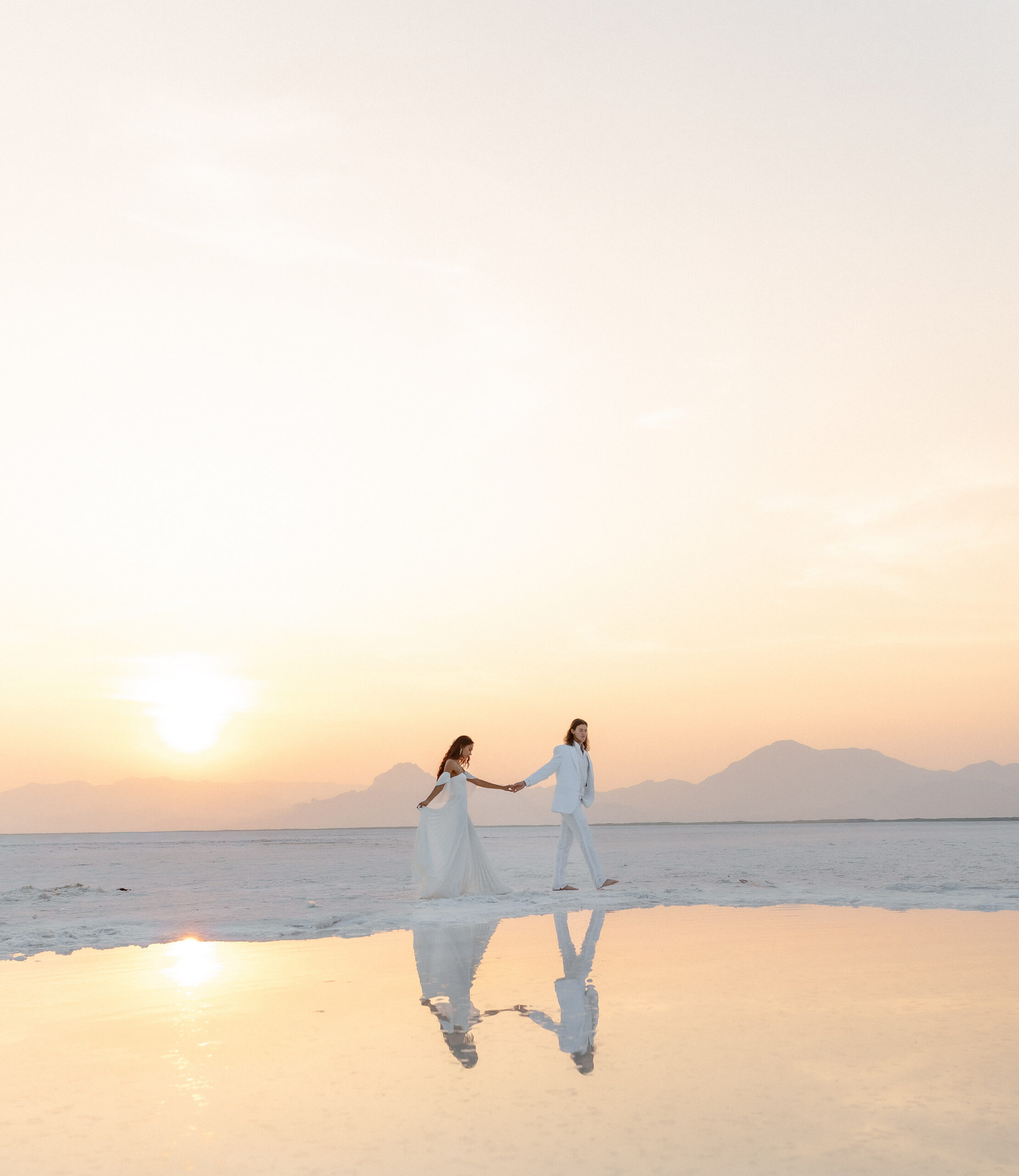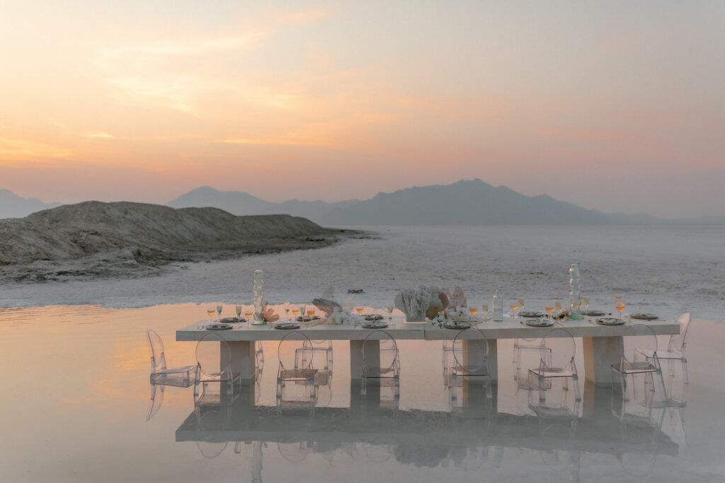 Flowing white fabrics drifted in the breeze while reflections danced across the water left from seasonal flooding. Their elegant dinner setup floated in the distance, making the entire scene feel cinematic and almost otherworldly.